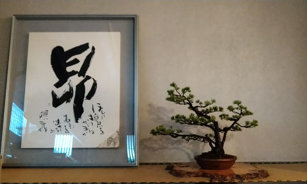 盆栽と書を展示販売。盆栽レストラン大宮の一部のスペース。