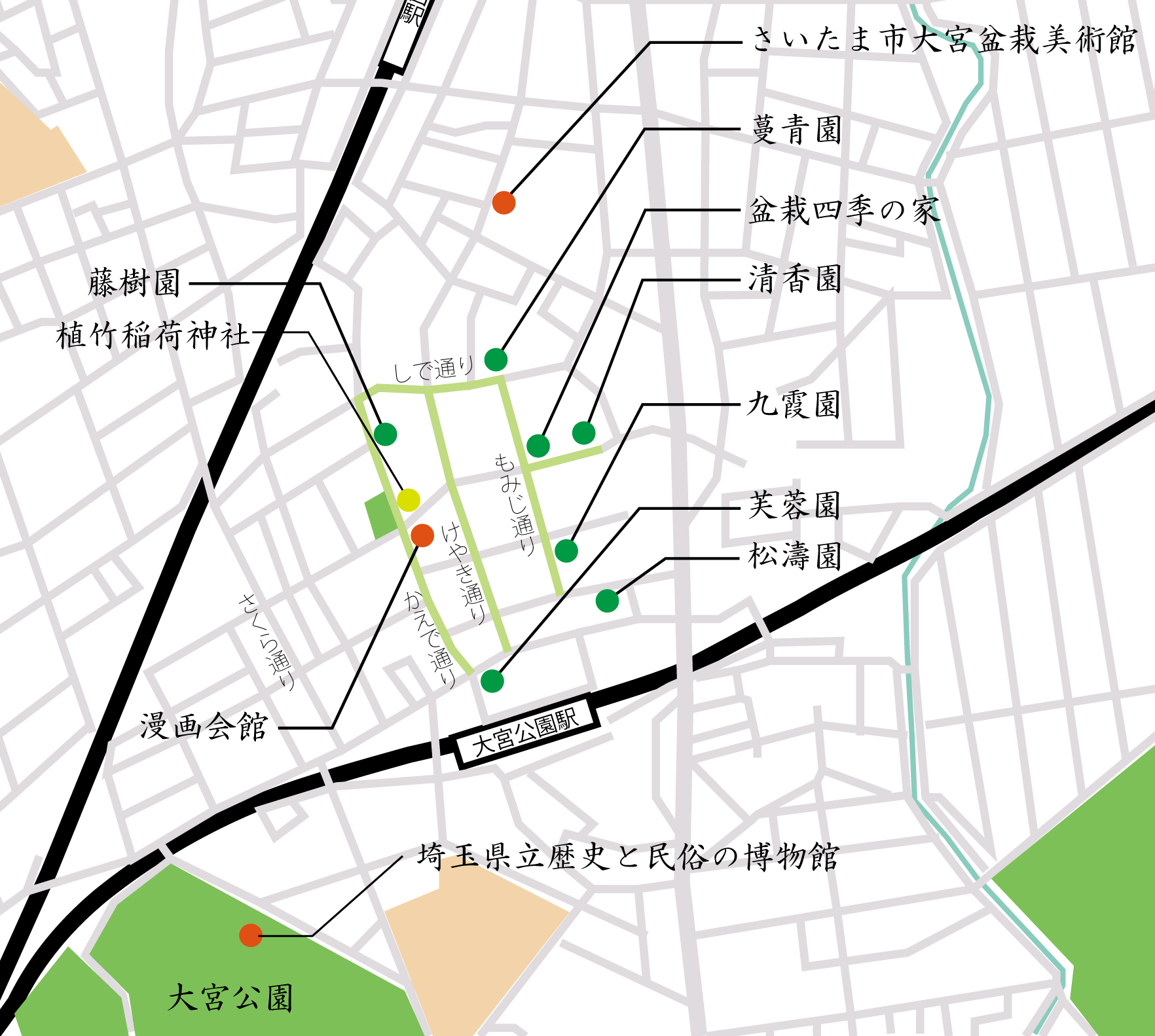 大宮氷川神社と大宮盆栽村に間に位置している。