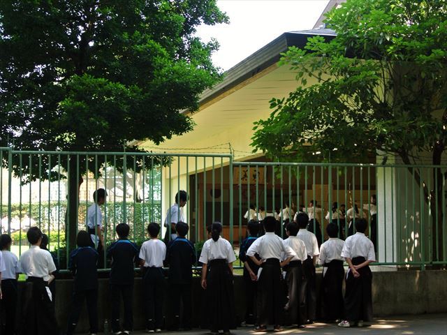 毎朝6:30には、多くの人が中央の時計台の周辺でラジオ体操を楽しんでいる。